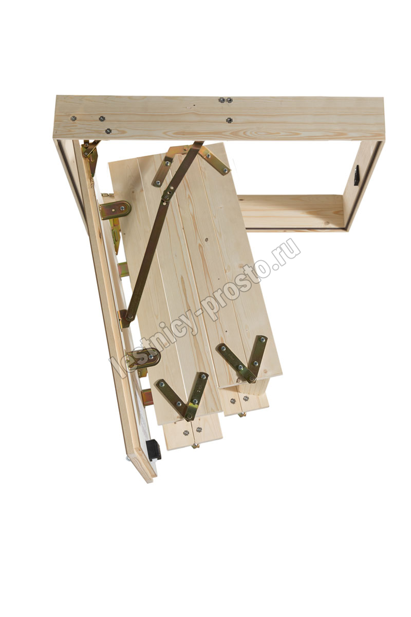 В комплекте: люк из сэндвич-панели, пружинный механизм "короб-рычаг", короб, четырехсекционная лестница с буковыми ступенями, замок люка, штанга для раскладывания лестницы, наконечники для ножек