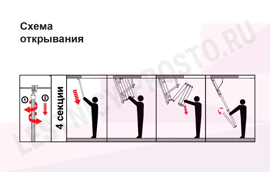 Лестница складная четырехсекционная, изготовлена из массива сосны. Термоизоляционная крышка типа "сэндвич" утеплена пенопластом толщиной 20 мм, облицована с двух сторон ДСП белого цвета.