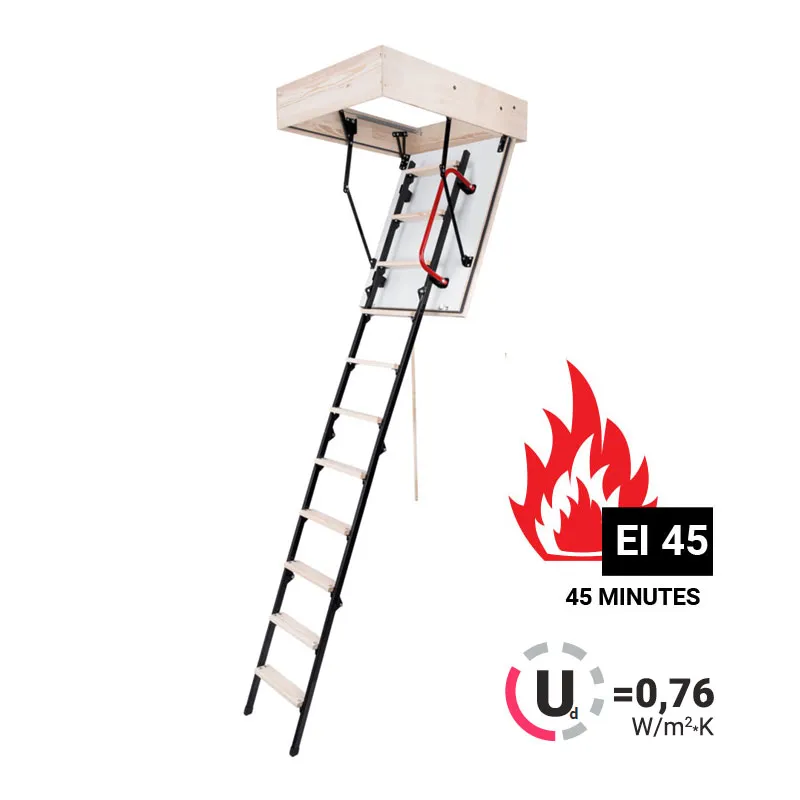 Лестница идеально подходит для установки в помещениях подверженных риску возгорания, её противопожарные свойства позволят эффективно изолировать помещение, в котором возник пожар, от чердака, тем самым предотвращая дальнейшее распространение огня. Предел огнестойкости (EI) 45 минут.