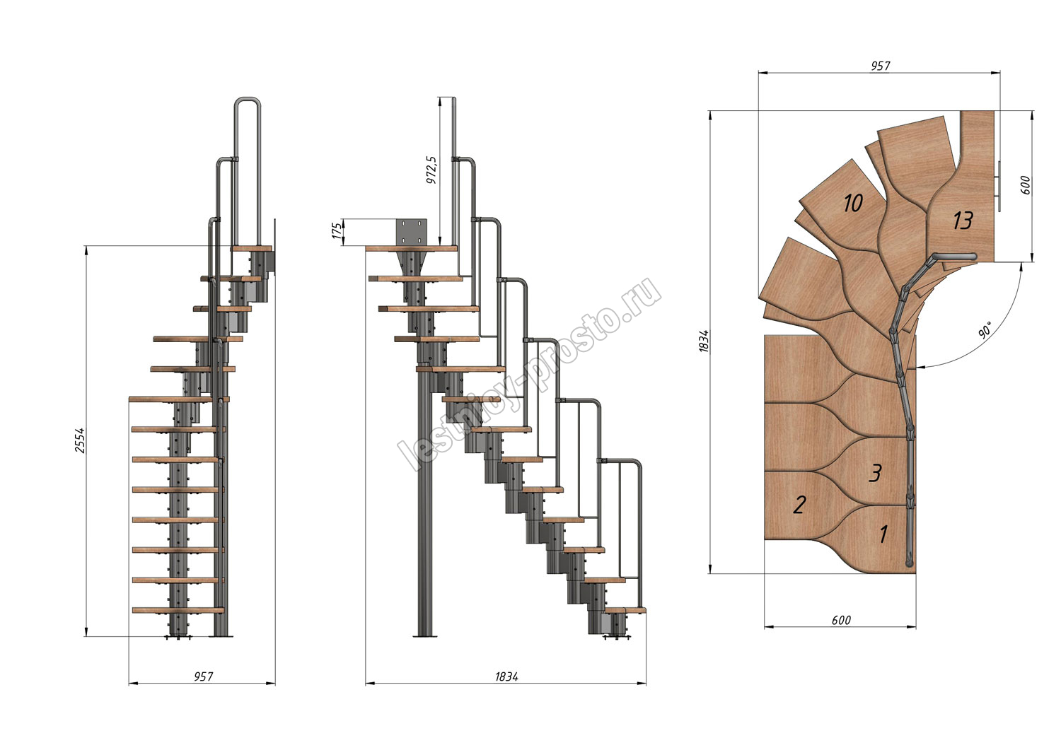 Лестница Prosto Urban Black гусиный шаг 600 мм, h234-336 см (13 ступеней), ясень