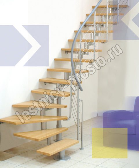 Есть возможность регулировать высоту ступеней. В комплект входят перила с вертикальными стойками и горизонтальными перегородками.