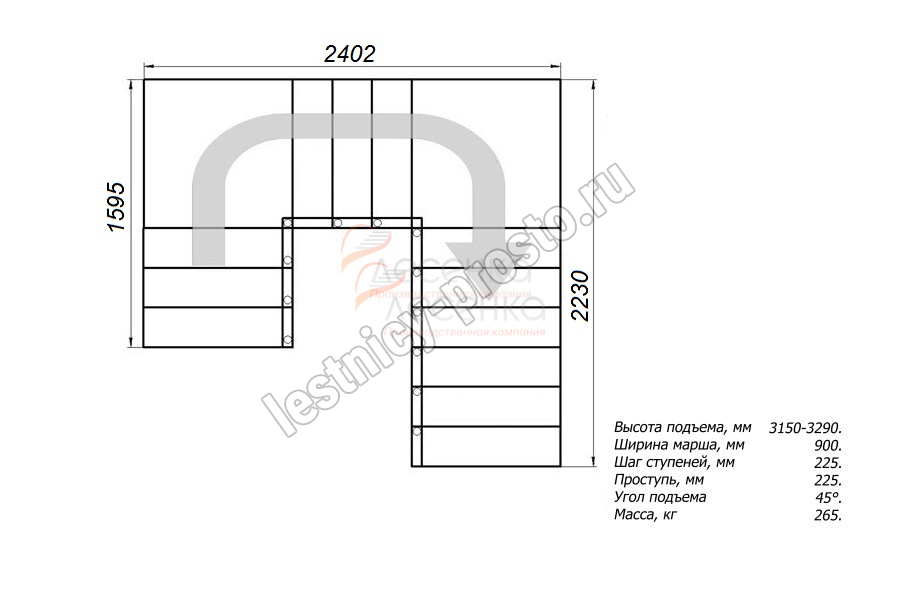 Модульная лестница Комфорт 225 3150-3290, Белый, Лиственница, Нержавеющая сталь