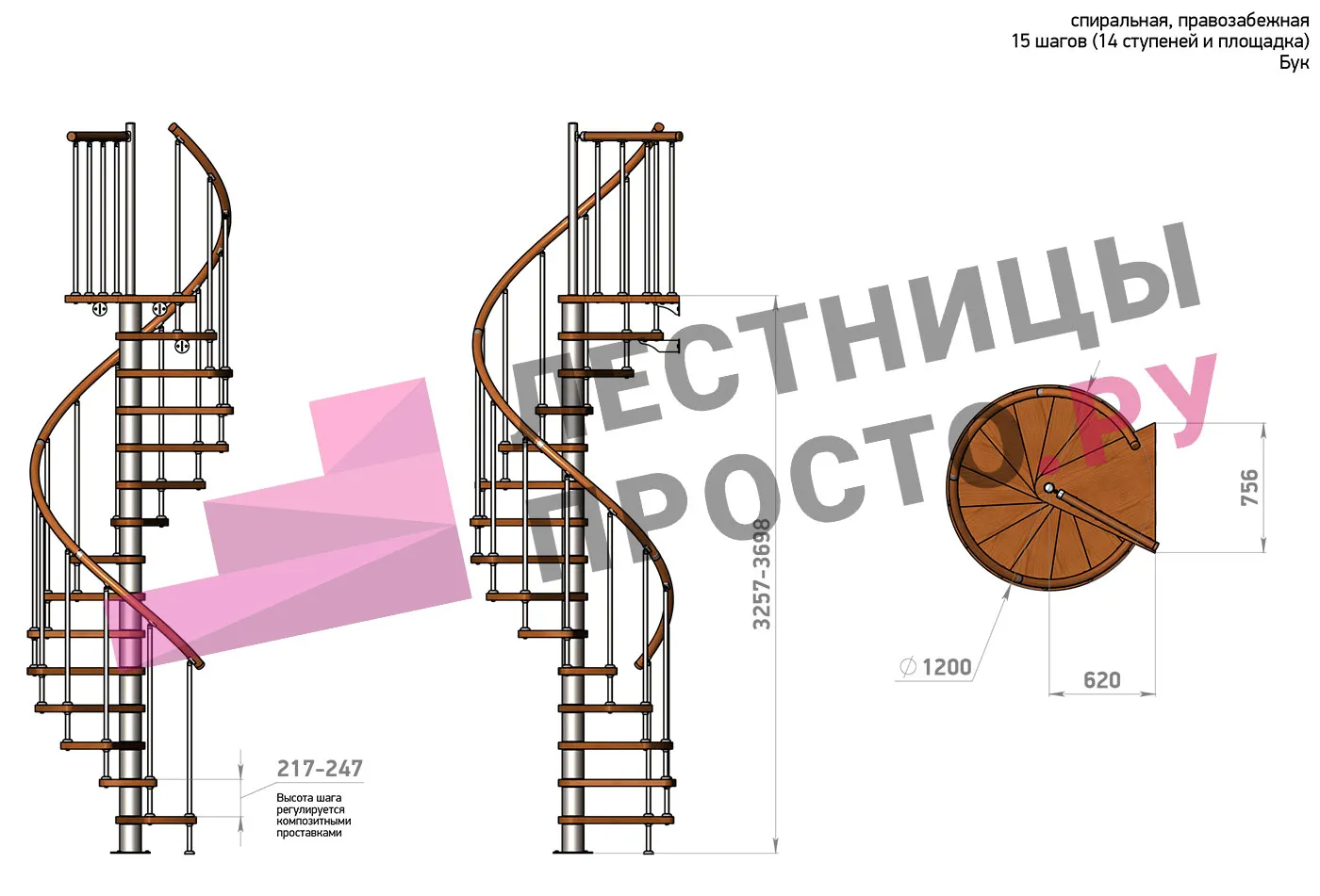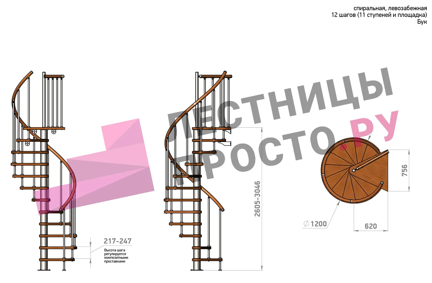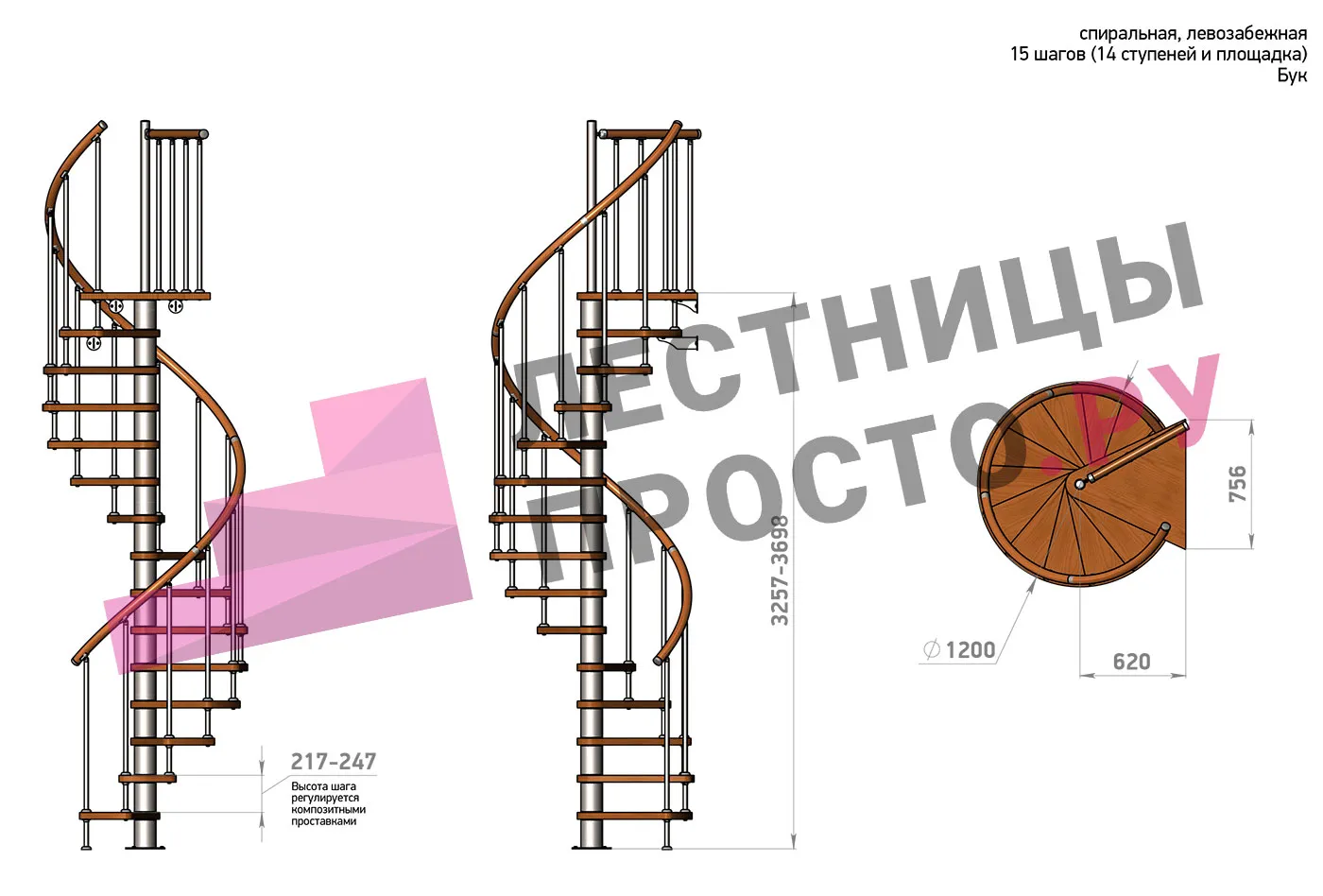 | Винтовая лестница Prosto Spiral Black D120см, h260.5-304.6 см, бук |