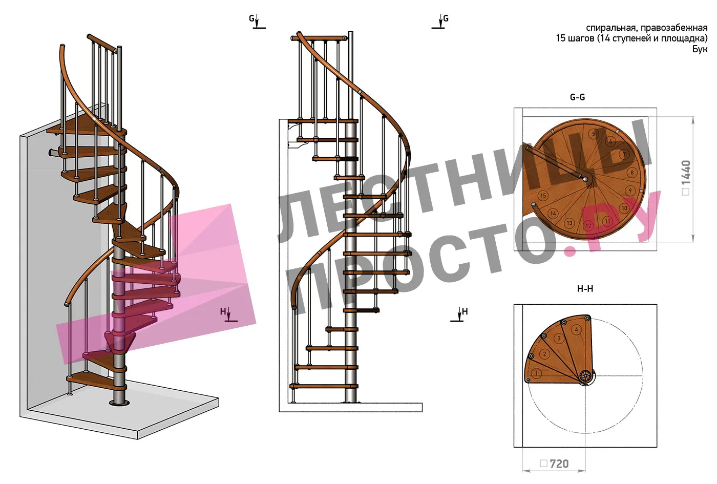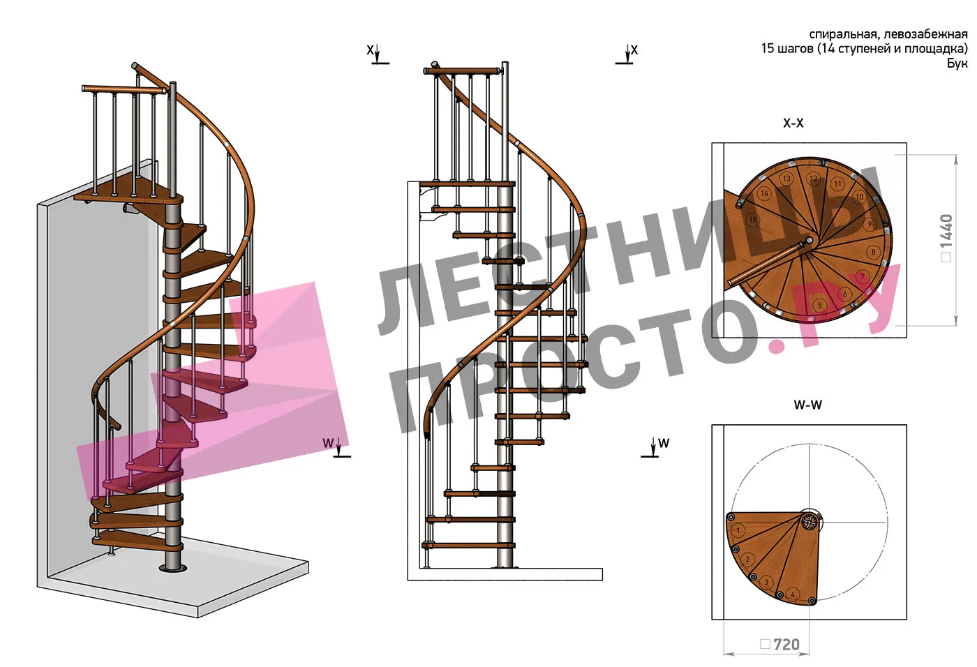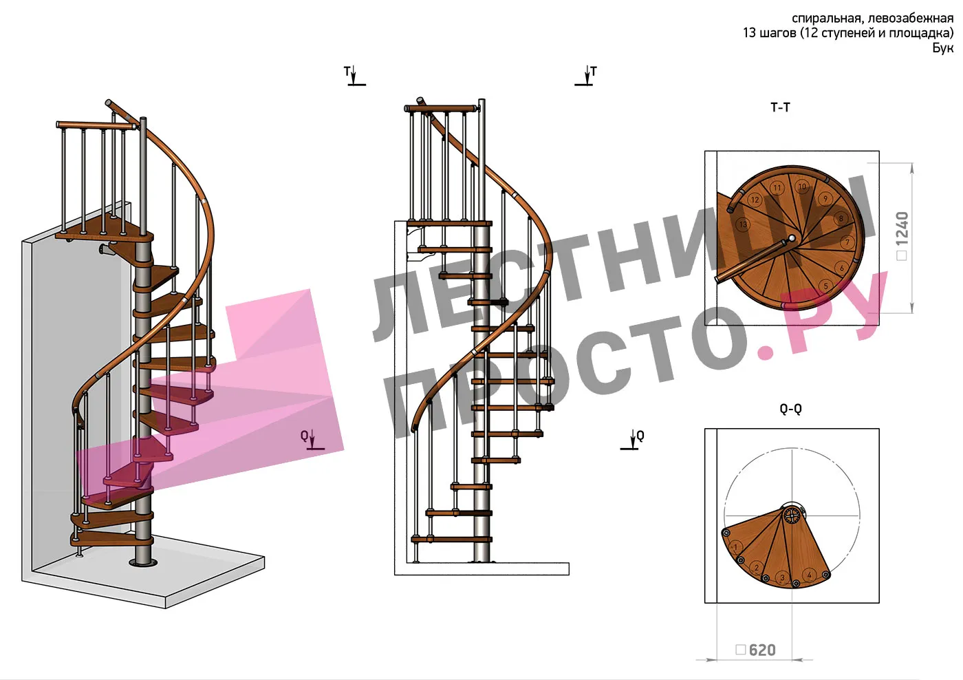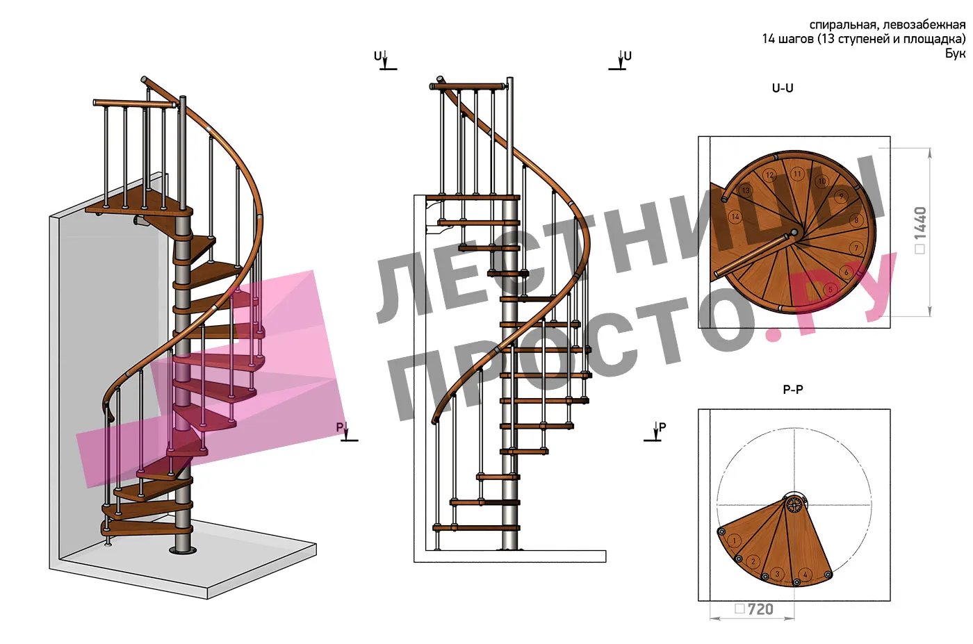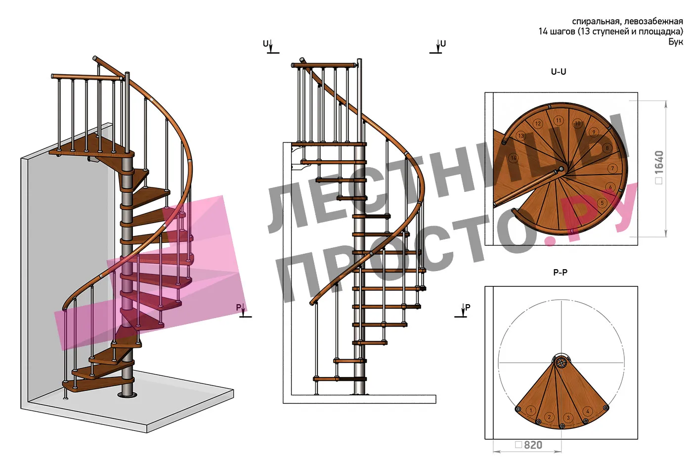 | Винтовая лестница Prosto Spiral Black D140см, h282.2-326,3 см, бук |