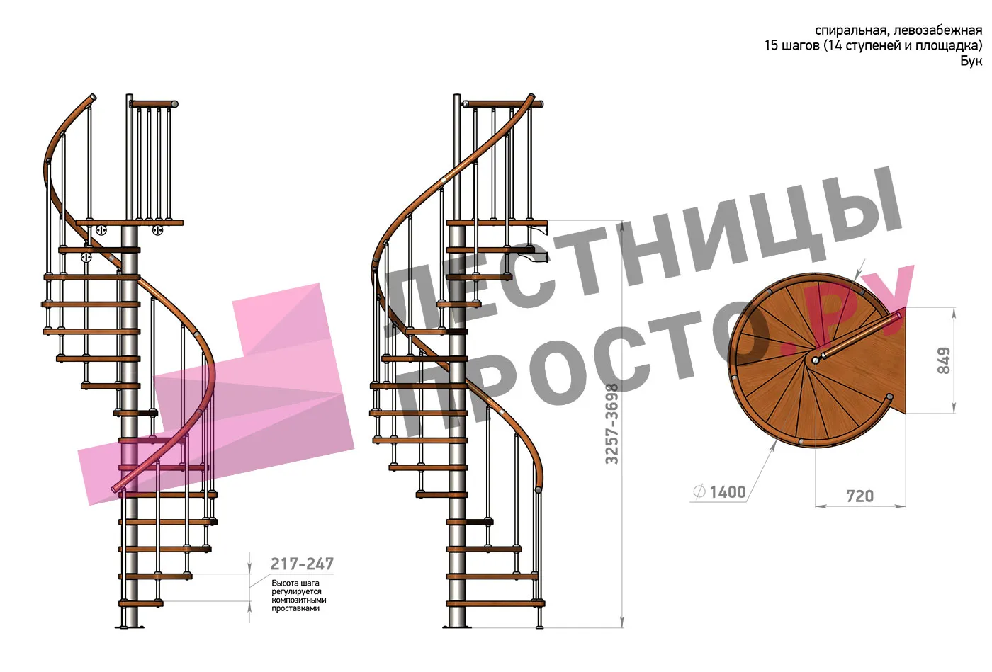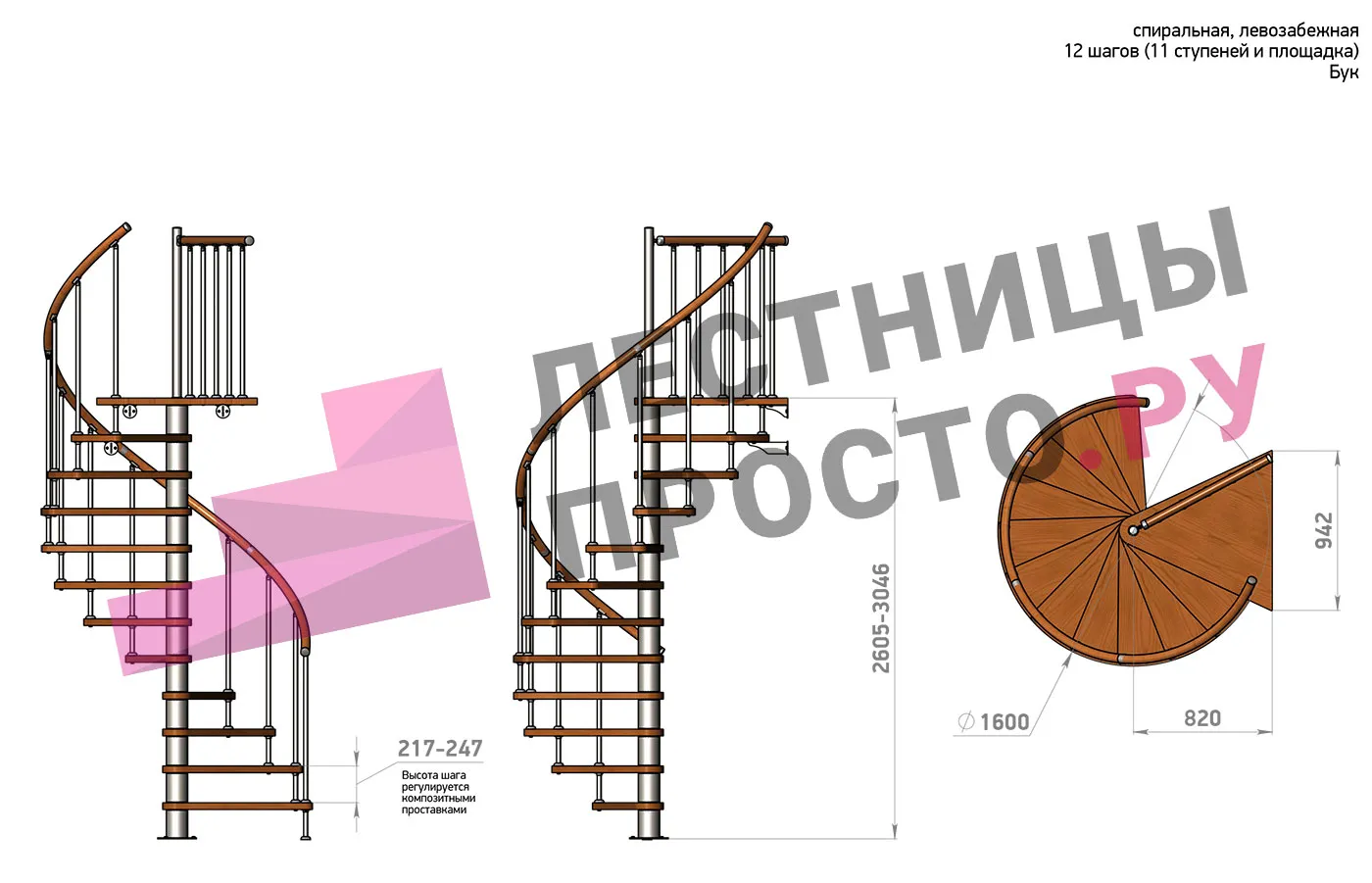 | Винтовая лестница Prosto Spiral Black D140см, h260.5-304.6 см, бук |