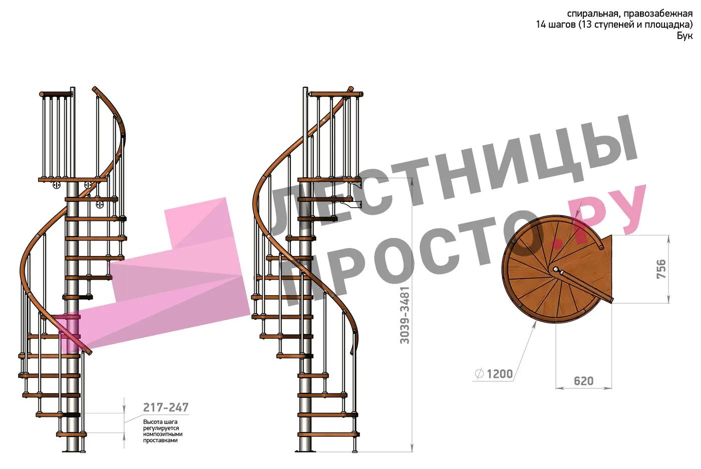 | Винтовая лестница Prosto Spiral Black D120см, h303.9-348,1 см, бук |